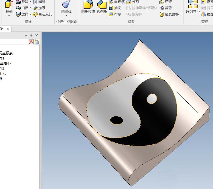 13、如下图所示,caxa3D实体中成功在曲面上画出了太极阴阳鱼。