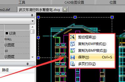 然后鼠标右键,选择“保存”按钮,进入保存状态。在所弹出保存对话框中选择文件存储位置,点击“保存”按钮。即可将图纸中一部分内容进行完成保存。