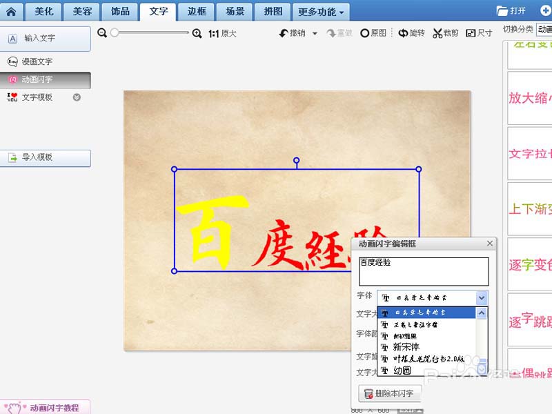 4、从动画闪字中选择逐字变大动画效果,接着输入文字内容,设置字体为田英章毛笔楷书。