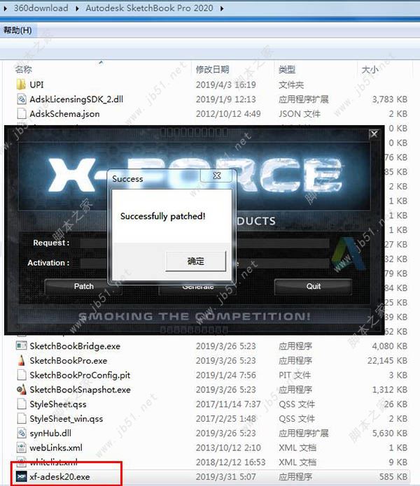 7、打开软件包,将注册机xf-adesk20.exe复制到软件安装目录,右键桌面快捷方式选择打开文件位置进入安装目录,运行注册机,点击patch打补丁,成功打补丁,如图所示。