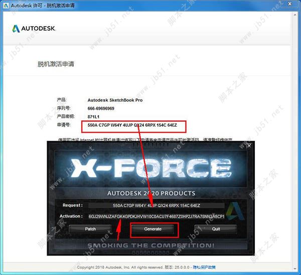 8、然后讲脱机激活界面的申请号复制到注册机中,点击generate生成注册码。