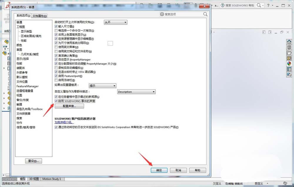 6、然后我们在启用solidworks事件的声音前打上勾再点击确定按钮就完成启用solidworks事件声音的设置了,如图所示;