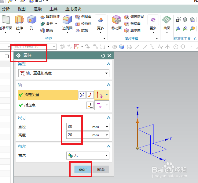 2、如下图所示,执行【菜单——插入——设计特征——圆柱体】,“圆柱”对话框中设置直径30,高度20,轴默认,点击“确定”。
