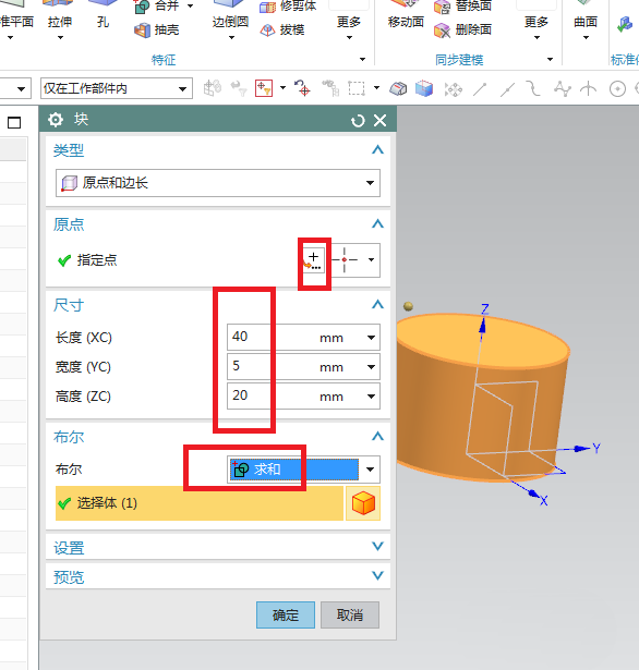 3、如下图所示,执行【菜单——插入——设计特征——长方体】,“块”对话框中设置长宽高为40、5、20、,布尔求和,指定点。