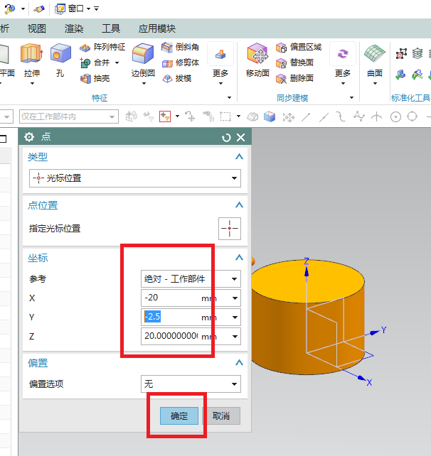 4、如下图所示,“点”对话框,输入点的坐标为(-20,-2.5,20),点击“确定”,回到“块”对话框中点击“确定”,完成长方体的创建。