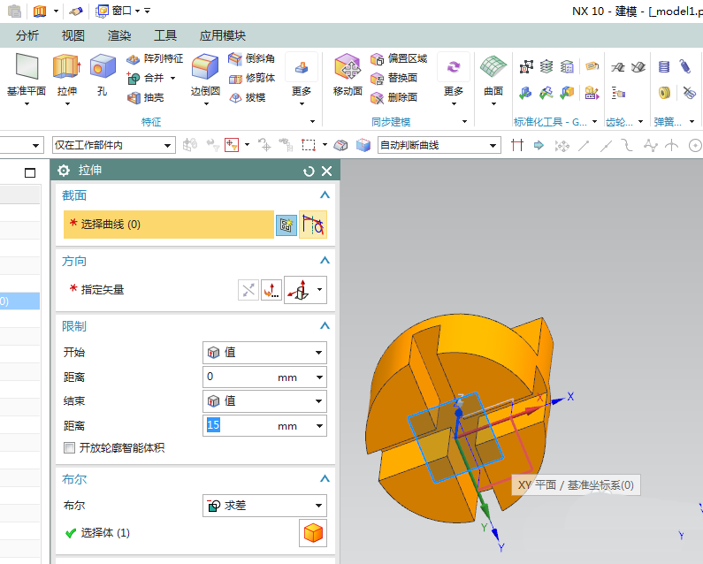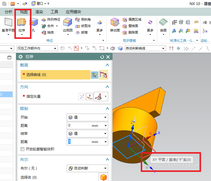 5、如下图所示,点击工具栏中的 拉伸 图标,激活 拉伸 命令,点击基准坐标系中的 XY平面 ,直接进入草图环境。