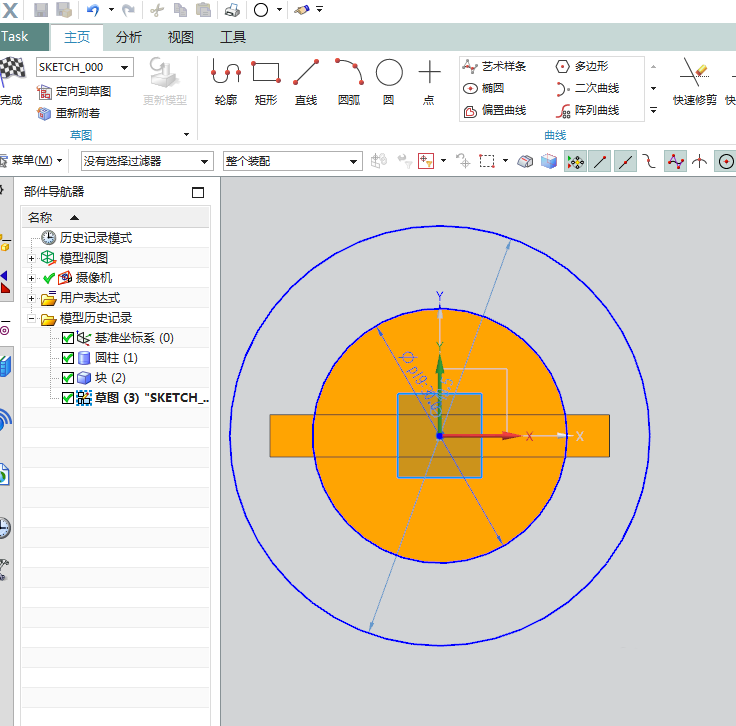 6、如下图所示,进入草图环境,首先激活草图工具栏中的 圆 命令,然后以坐标原点为圆心画两个圆,然后双击修改圆的直径,大圆超过实体即可,小圆直径ø30,最后点击“完成”,退出草图。