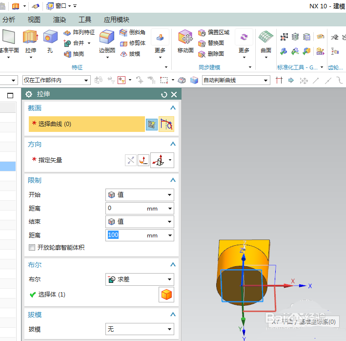 7、如下图所示,回到 拉伸 对话框 ,布尔求差,自动选择实体,限制为:从0开始,到100结束,看着预览效果调整方向,点击“确定”,