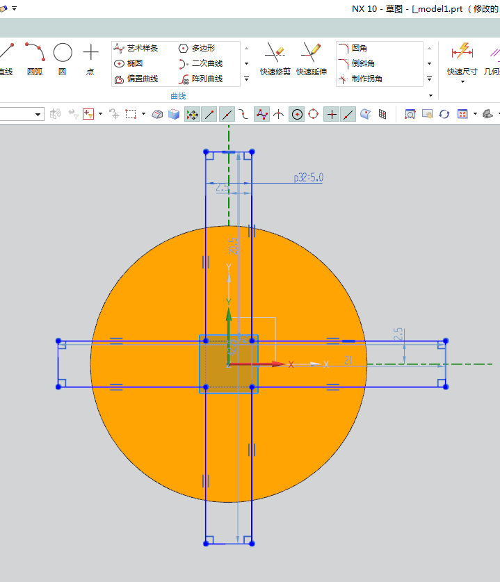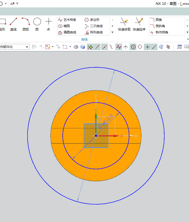 12、如下图所示,又是激活圆命令,以坐标原点为圆心画两个圆,双击修改圆的直径,大圆超过实体即可,小圆直径为ø22,最后点击“完成”。