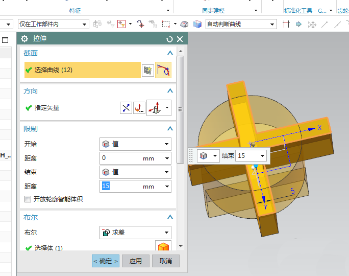 10、如下图所示,限制为从0开始,15结束,看着预览调整方向,布尔求差,自动选择实体,点击“确定”。