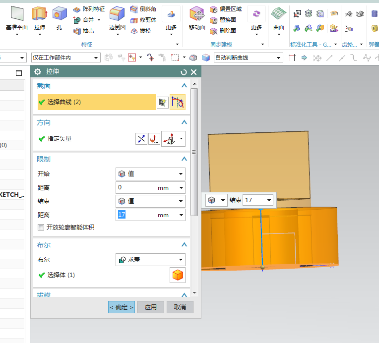 13、如下图所示,布尔求差,自动选择实体,看着预览效果决定是否反向,限制为从0开始,17结束,点击“确定”。