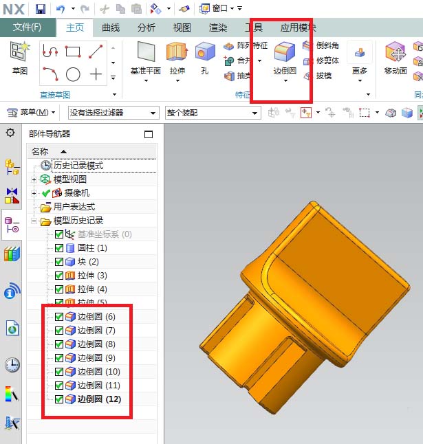 14、如下图所示,激活边倒圆命令,一步一步的去进行边倒圆操作,根据实际效果,设置边倒圆半径,看设计树可以得知笔者进行了多次边倒圆。
