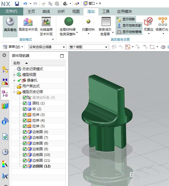15、如下图所示,设计树中隐藏基准坐标系,渲染——真实着色——全局材料绿色亮泽塑料。最后的效果就如下图所示了。