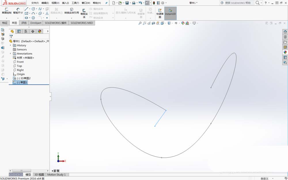 3、在空间曲线起始点绘制一个草图,绘制另一条空间曲线