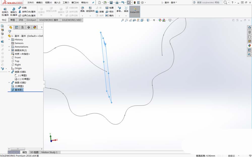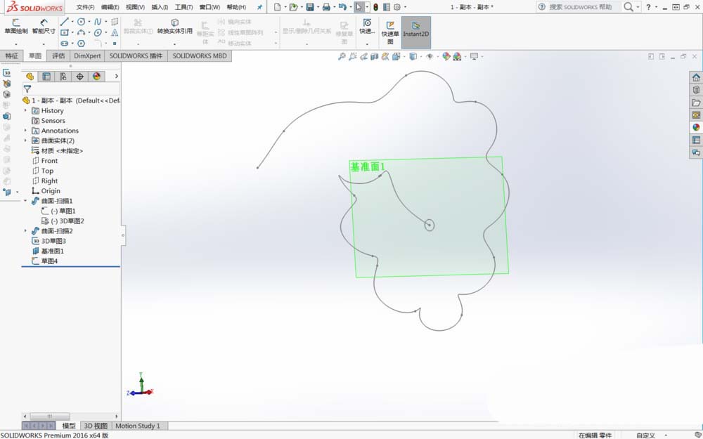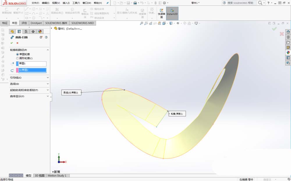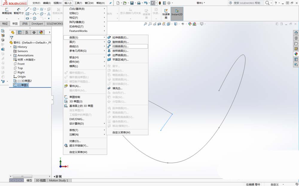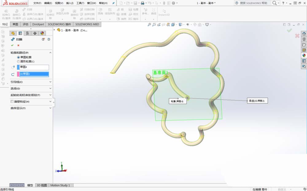 6、在最开始建立的空间曲线起始点绘制草图,进行实体扫描