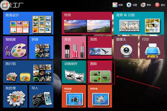 1、图片上出现各个文字Logo等内容时,将会极大影响用户观看图片时的体验,这时候就可以使用图片工厂来帮助你了,不过图片工厂中并没有去除文字的功能,大家可以利用软件中的擦除功能来帮助,直接点击主界面中的“擦除”选项,如下图所示: