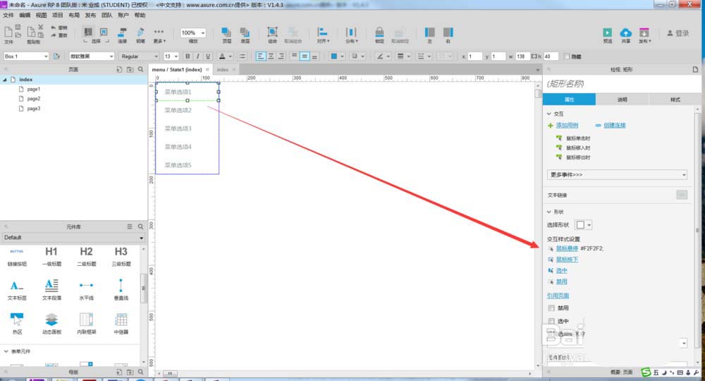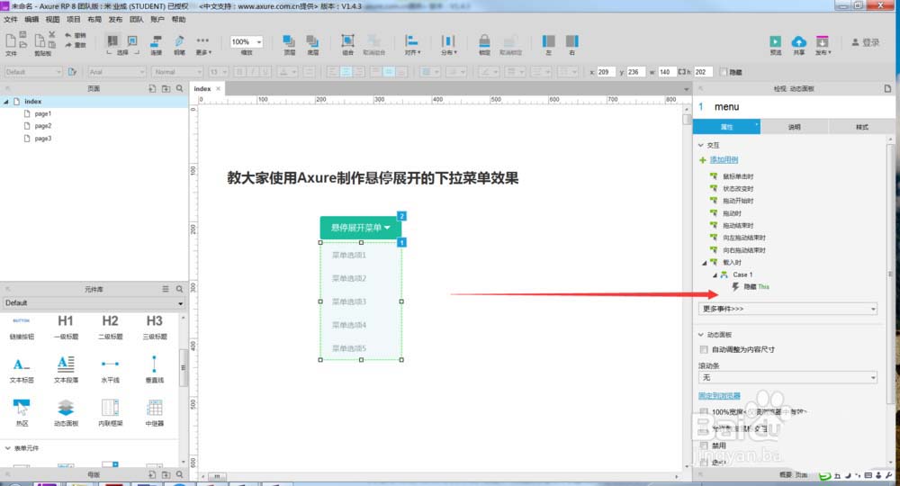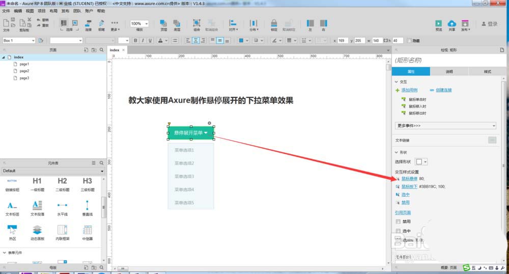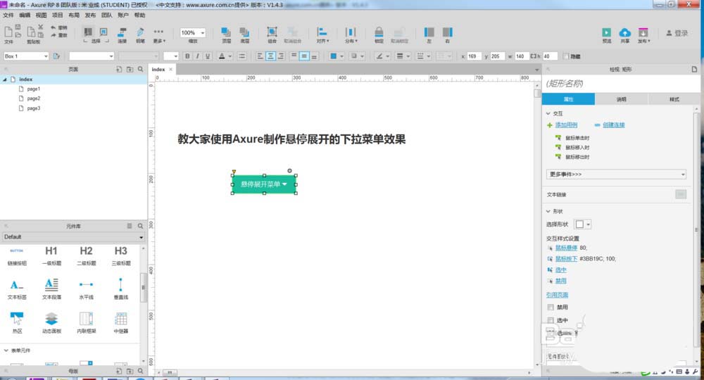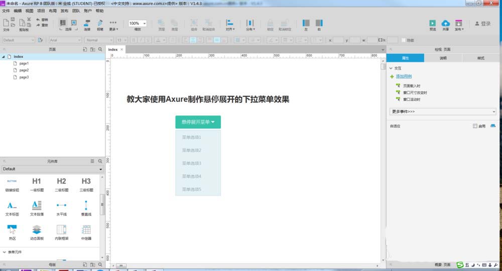 1、打开Axure,今天教大家使用Axure制作悬停展开的下拉菜单效果,如下图所示。