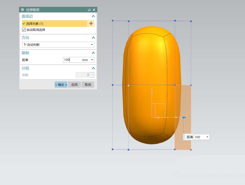 2、对球体上方进行拉伸框架100毫米,然后右边也拉伸100毫米。