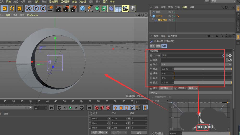 6、找到下方属性中的尺寸属性,将曲线调整到如图选项,这样就得到了想要的月牙效果了。