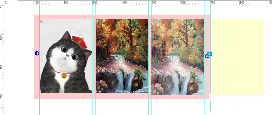 以四个图为例,实例中的每个图宽180px,为四个图命名1234,并将图123之间的间距调整为10,123为显示,4为隐藏(属性),图4放置在底图最右边的边缘位置;