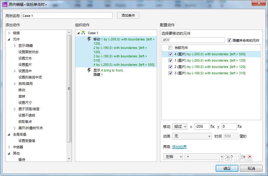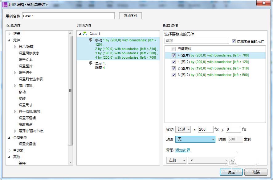2、实现在显示区域展示图234,隐藏图1效果(右侧按钮图标用例)。选中右侧按钮,“鼠标点击时”-添加用例;在弹出窗口点击“元件”下的“移动”,在最右侧“配置动作”进行1234的配置,具体内容如下: