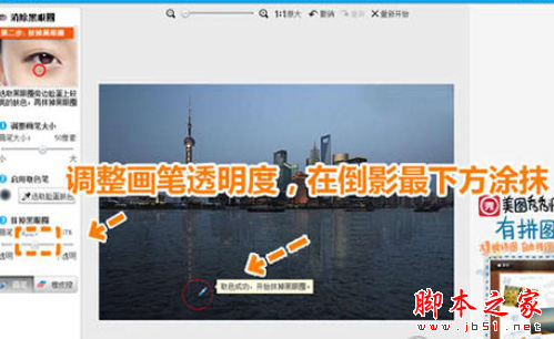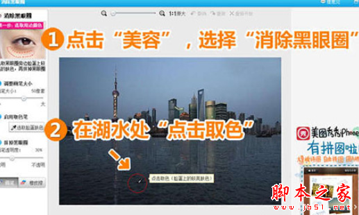 第四步:需要进入“美容”菜单,选择“消除黑眼圈”功能,用画笔在湖水无倒影处“点击取色”。