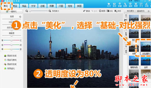 第六步:回到“美化”菜单,选择“基础-对比强烈”特效,透明度设为80%。