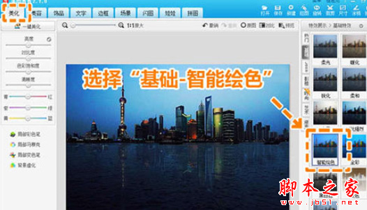 最后一步:选择“基础-智能绘色”特效,让夜景光影更美。