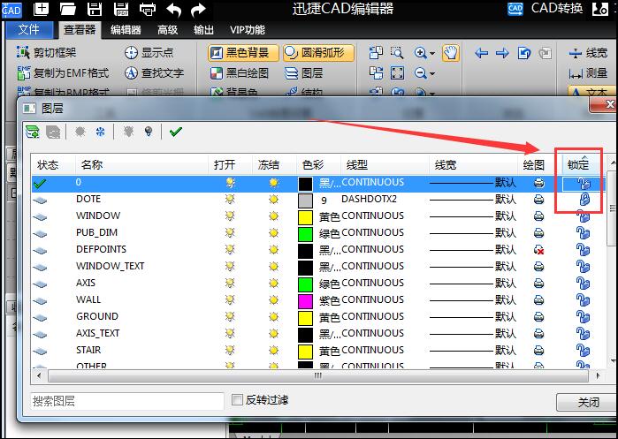 在所弹出的图层窗口将锁定图层进行解锁,即 可恢复图纸编辑功能。