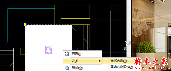 5、然后,我们就可以在CAD图中看到已经成功插入的OLE对象啦,这里我们如果看不到OLE对象内容,可以选择OLE对象,点击右键,选择【OLE】—【