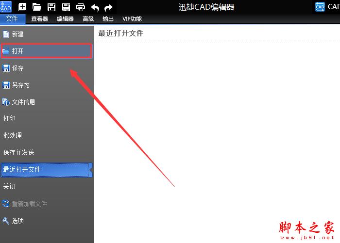 打开最新版本迅捷CAD编辑器,点击软件软件界面里的“文件”-“打开”选项,将要打印的CAD文件打开