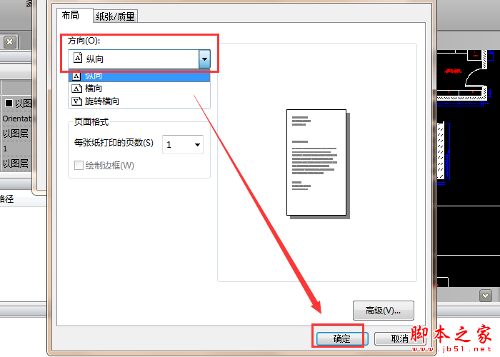 接下来点击“布局”里的“方向”选项,然后将“方向”修改为纵向,之后点击“确定”按钮