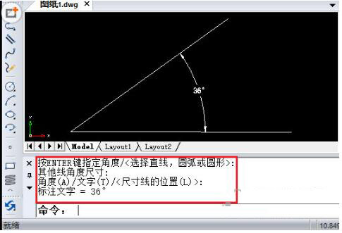 例子中绘制的角,锐角角度会自动标注文字显示为36°。