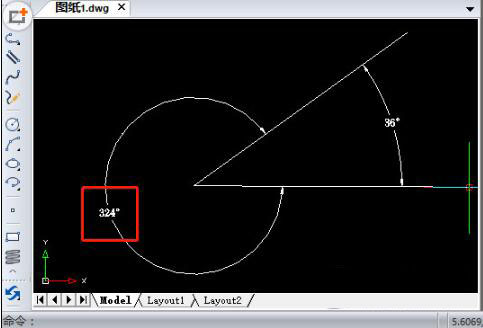 这时候绘图框中的角不 再标注出锐角度数,而是直接标出钝角度数324°。