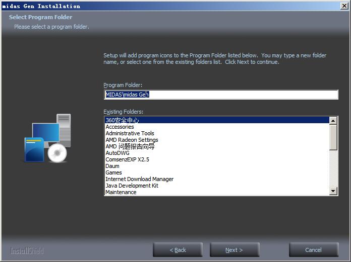 6、继续next选择开始菜单文件夹名称,默认为“MIDAS\midas Gen”