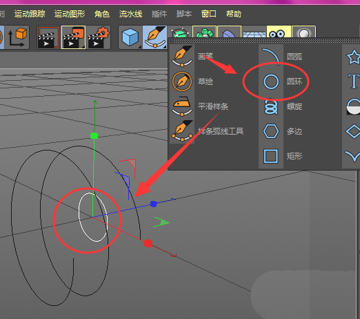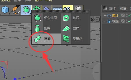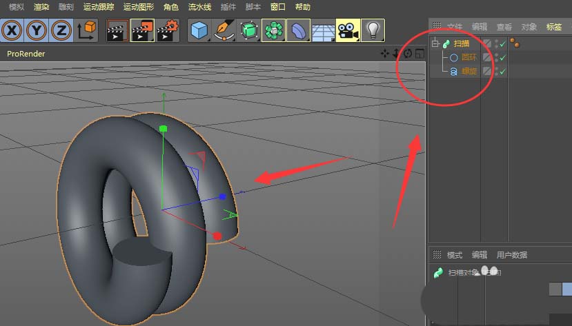 5、如图,将圆环和螺旋放到扫描里面,圆环要放到上层位置,然后得到一个有厚度的螺旋