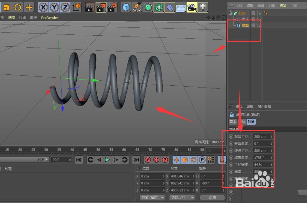 6、选中螺旋,在属性中调节螺旋的高度以及旋转半径数量,得到最后效果。