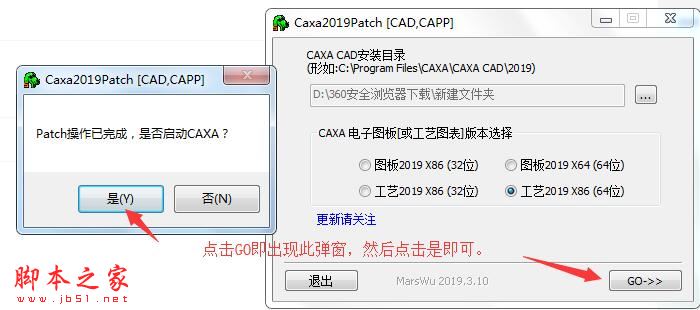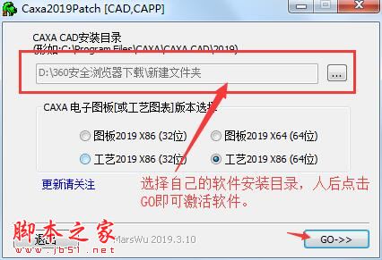 2、先选择软件安装路径,然后选择需要需要激活的版本,然后点击go即可激活软件(我们这款软件是工艺图表,所以选择工艺2019x86(64位))。