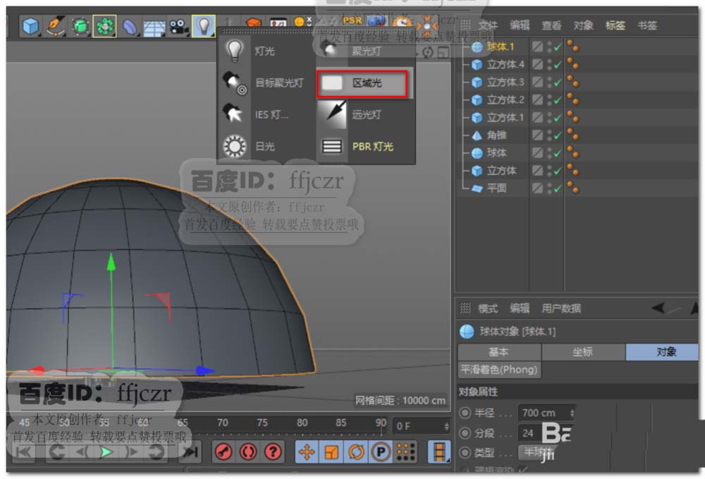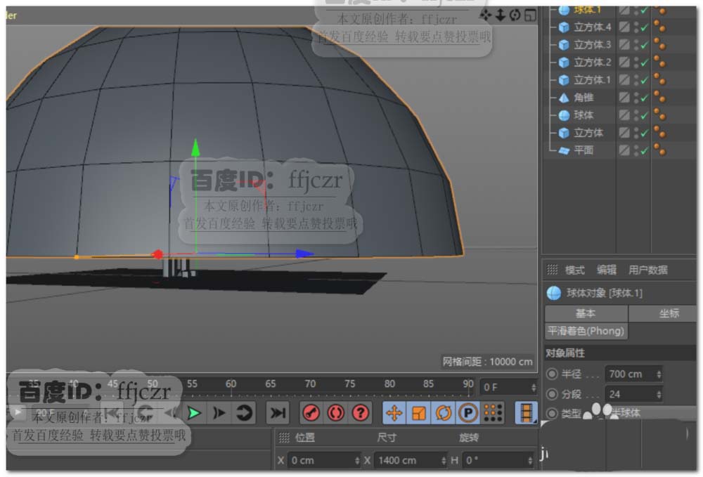 3、创建一个半圆球,其大小为刚好将作为地面的平面罩住,并离地面有一定的距离。可以想象成这是为搭建灯光阵的架子。