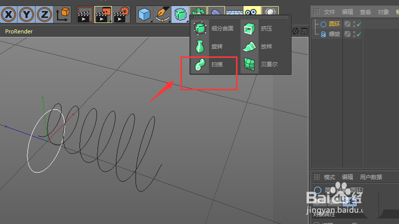 1、如图,打开C4D后,找到钢笔图标该工具下的螺旋选项