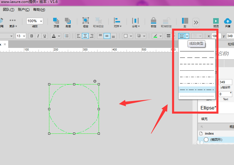 7、在线段类型属性中,还可以调节其中的各种类型效果,有直线型、虚线等效果。