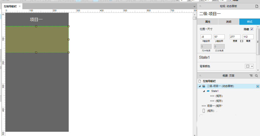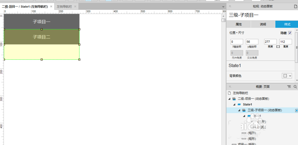 3、将子项目一、二装换为动态面板,并命名二级-项目一,设为隐藏,移动到项目一