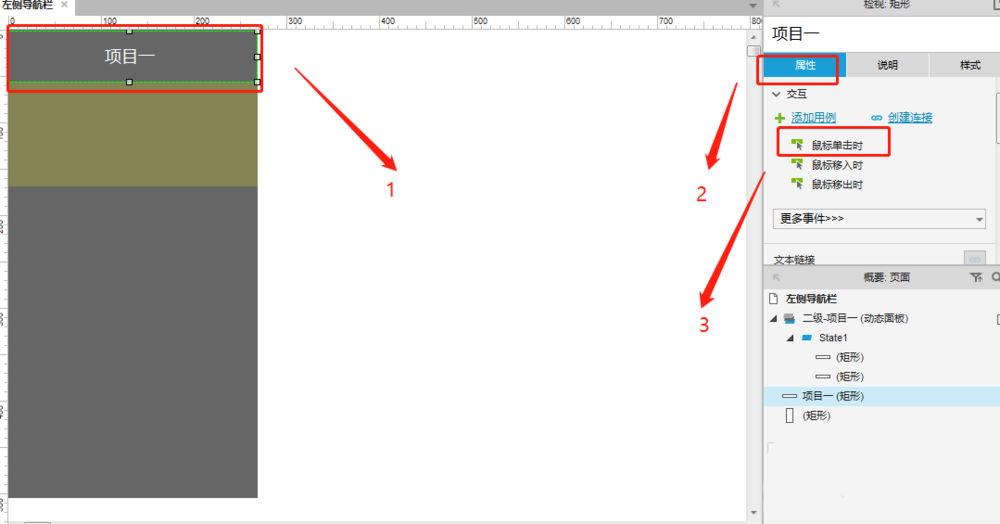 4、点击项目一,选择左侧的属性框,选择鼠标单击时