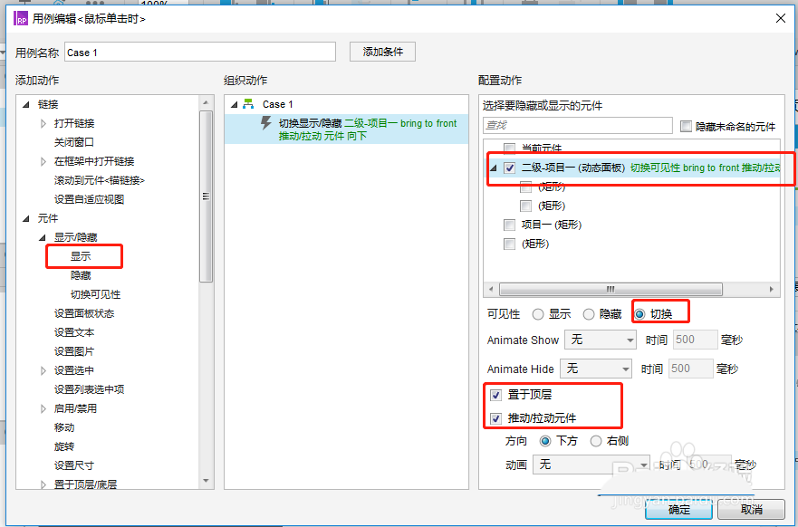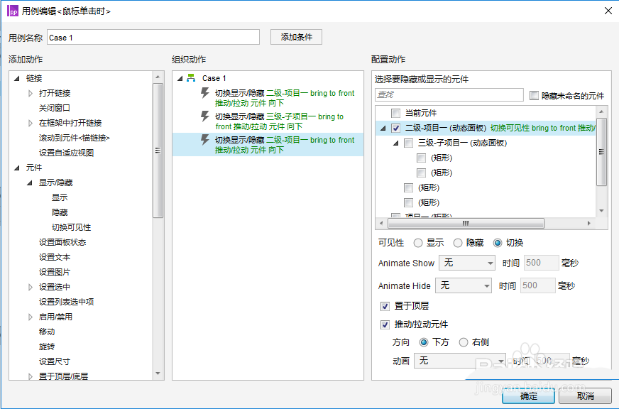 7、同样的在子项目一的属性里选择鼠标单击时,此时交互动作略有变化,首先隐藏二级-项目一,显示三级-子项目一,显示二级-项目一,勾选动作如图即可