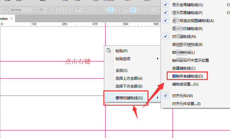 3、在右键属性栏中,可以找到如图的删除所有参考线设置,选择即可删除所有参考线