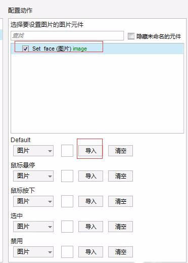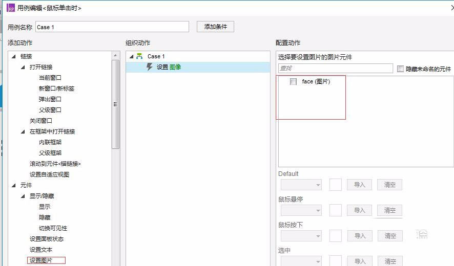 3、在添加动作中单击设置图像,在配置动作发现只有图片元件,没有矩形元件。