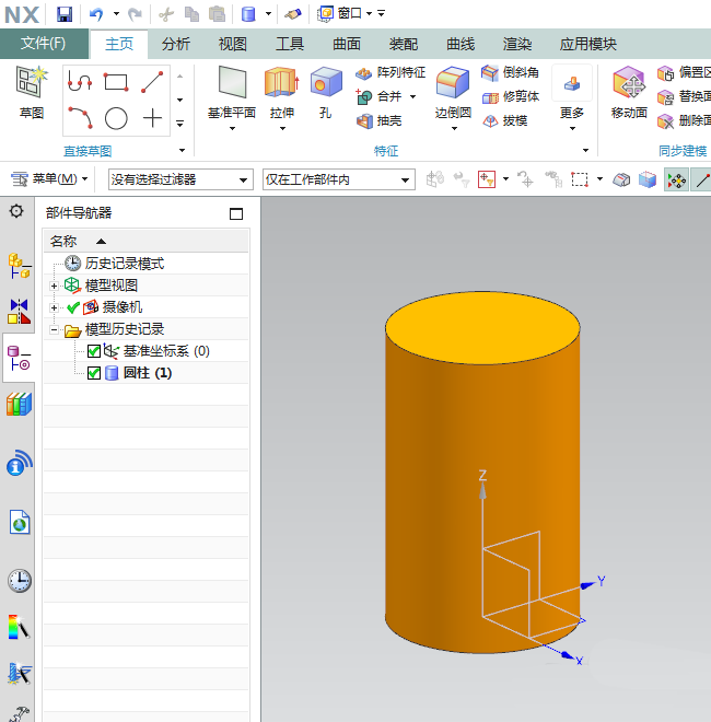 2、如下图所示,执行【菜单——插入——设计特征——圆柱体】,一切默认,创建一个圆柱体作为后面的演示所用。