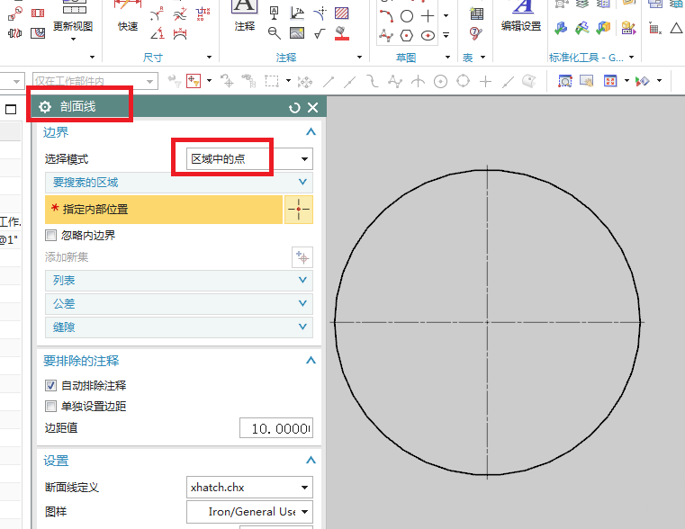 5、如下图所示,软件中出现了一个“剖面线”对话框,然后“选择模式”选择“区域中的点”,这有可能会是默认的。