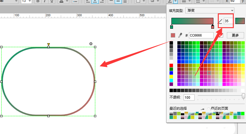 5、选择渐变颜色,右侧角度栏可以调整渐变的角度