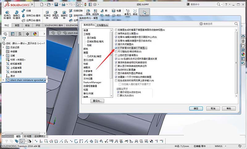 6、我们找到打开新零件时直接打开草图并在前面打上对号,如图所示;